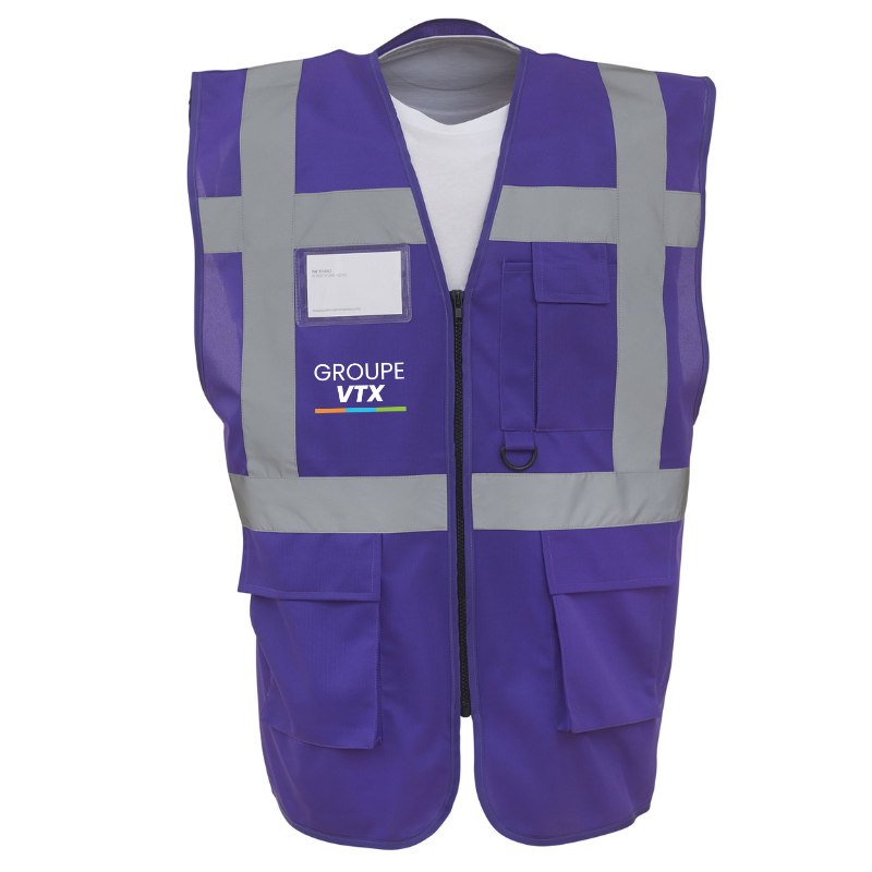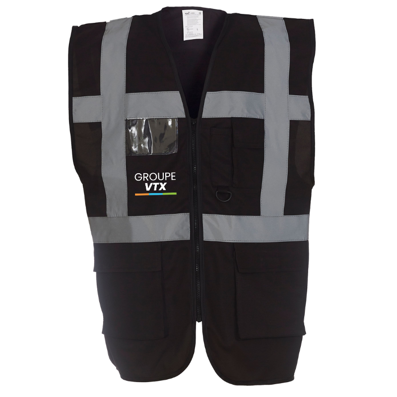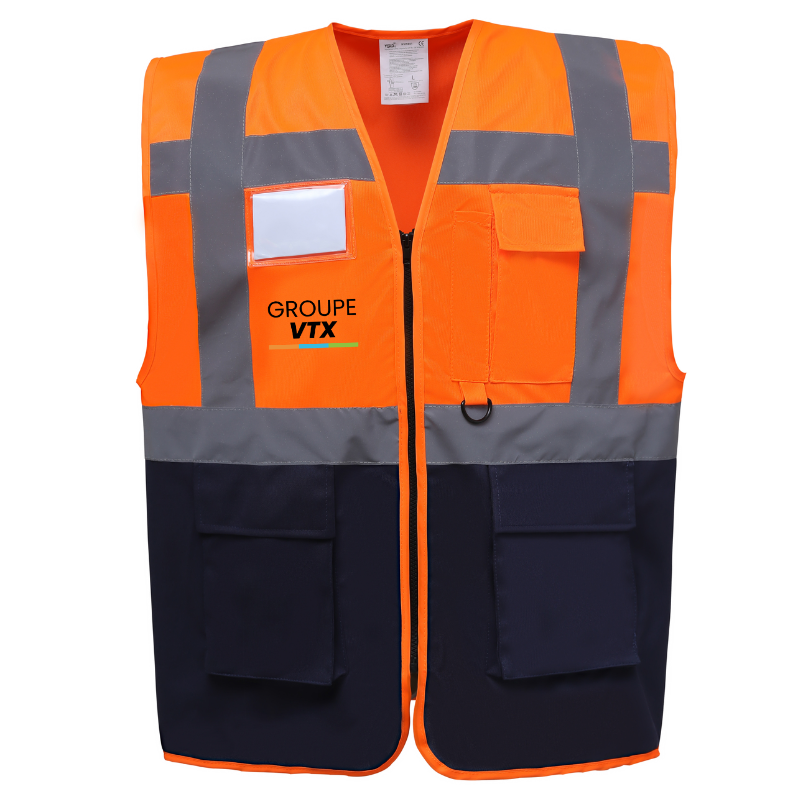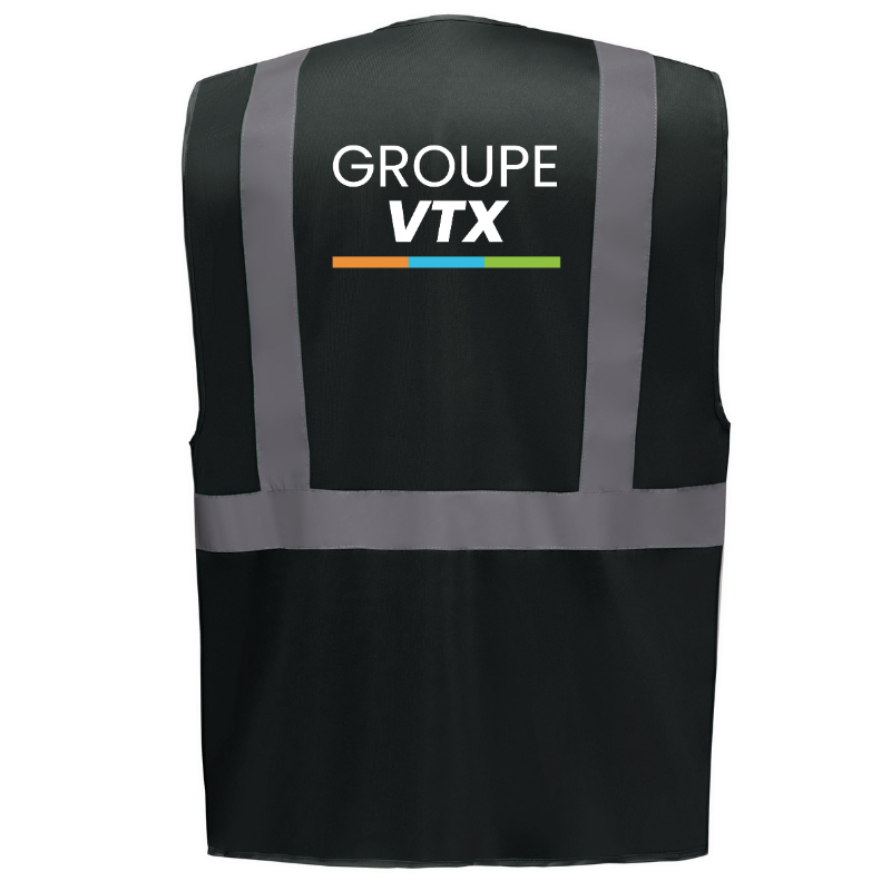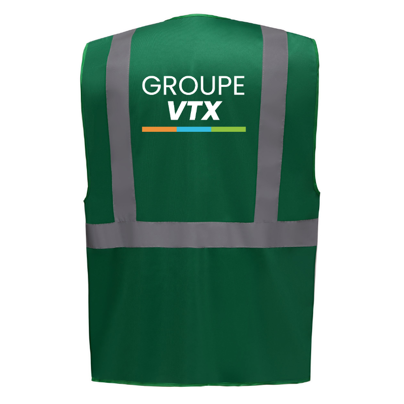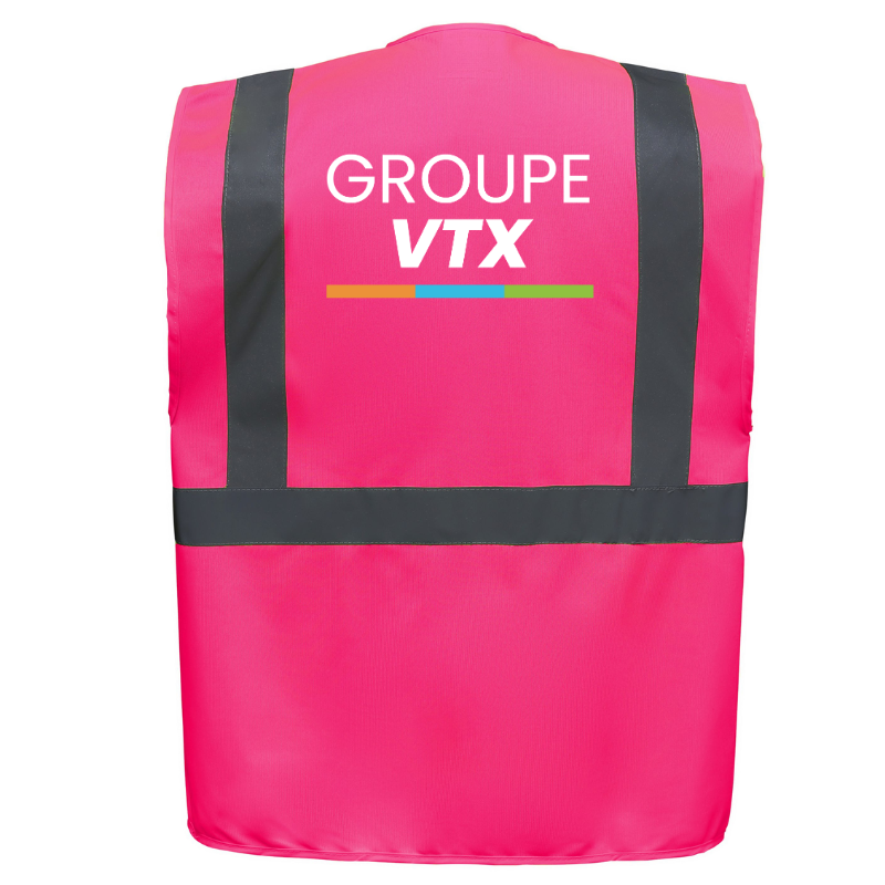 Le marquage est inclus avec le logo GROUPE VTX apposé à la poitrine et dans le dos par un transfert DTF de haute qualité, assurant durabilité et visibilité de votre image de marque.